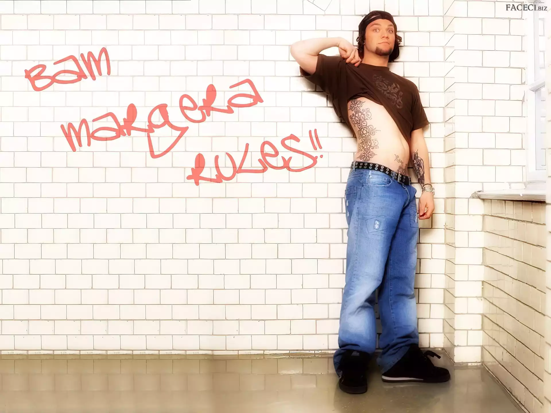 zegarek, Bam Margera, deskorolka okulary, Bam Margera, butelka włosy, Bam Margera, ciemne okulary, Bam Margera, twarze kurtka, Bam Margera, rozpięta t-shirt, Bam Margera, brązowy